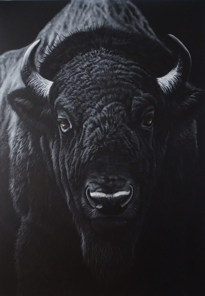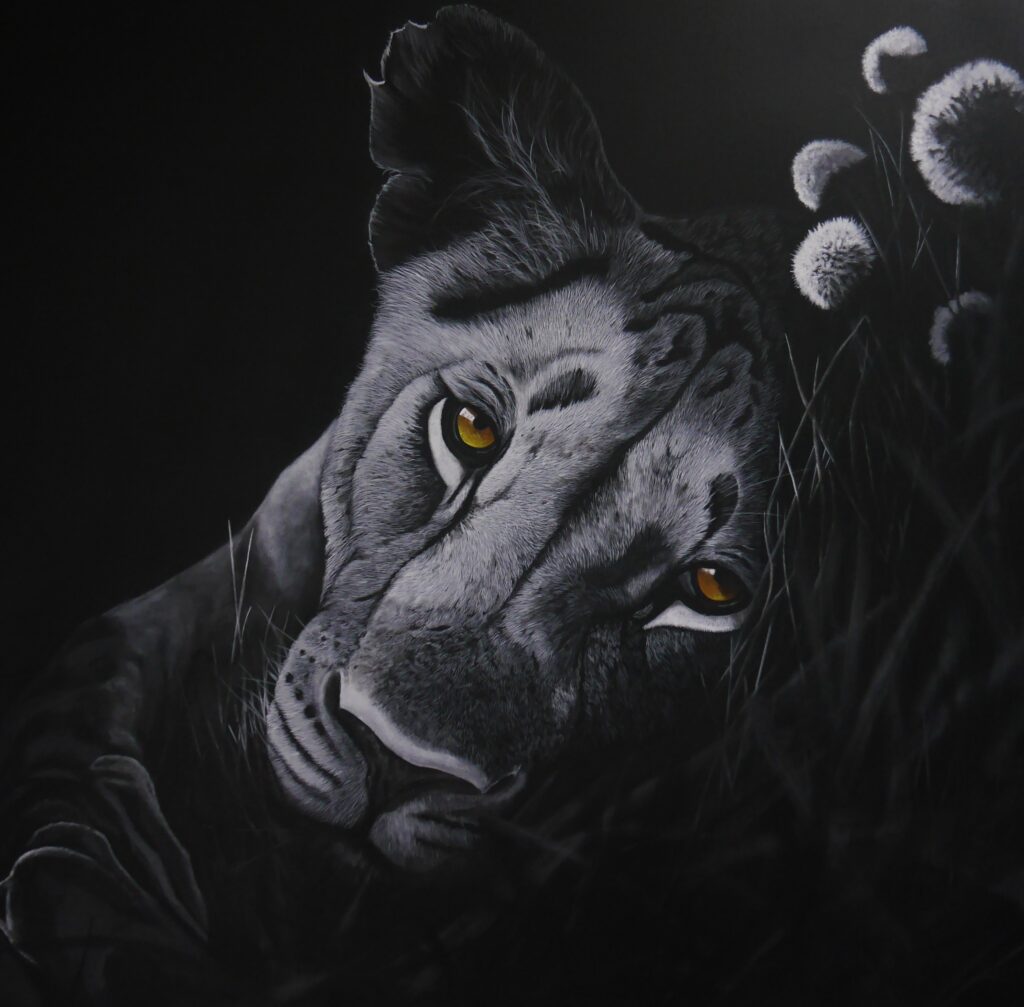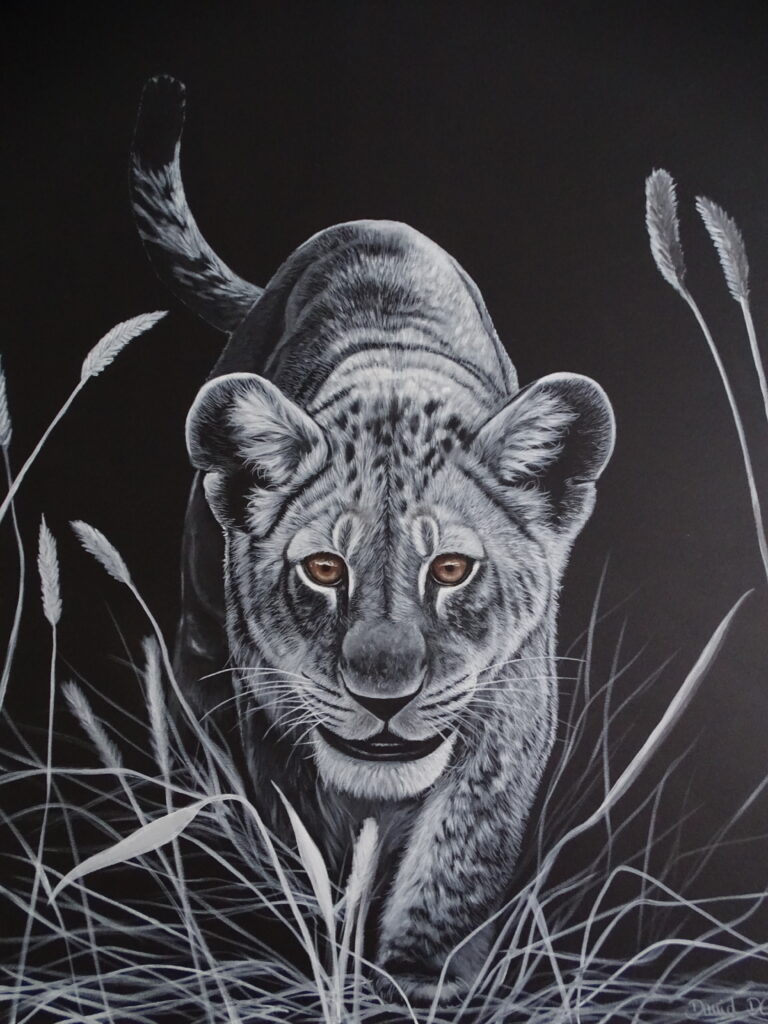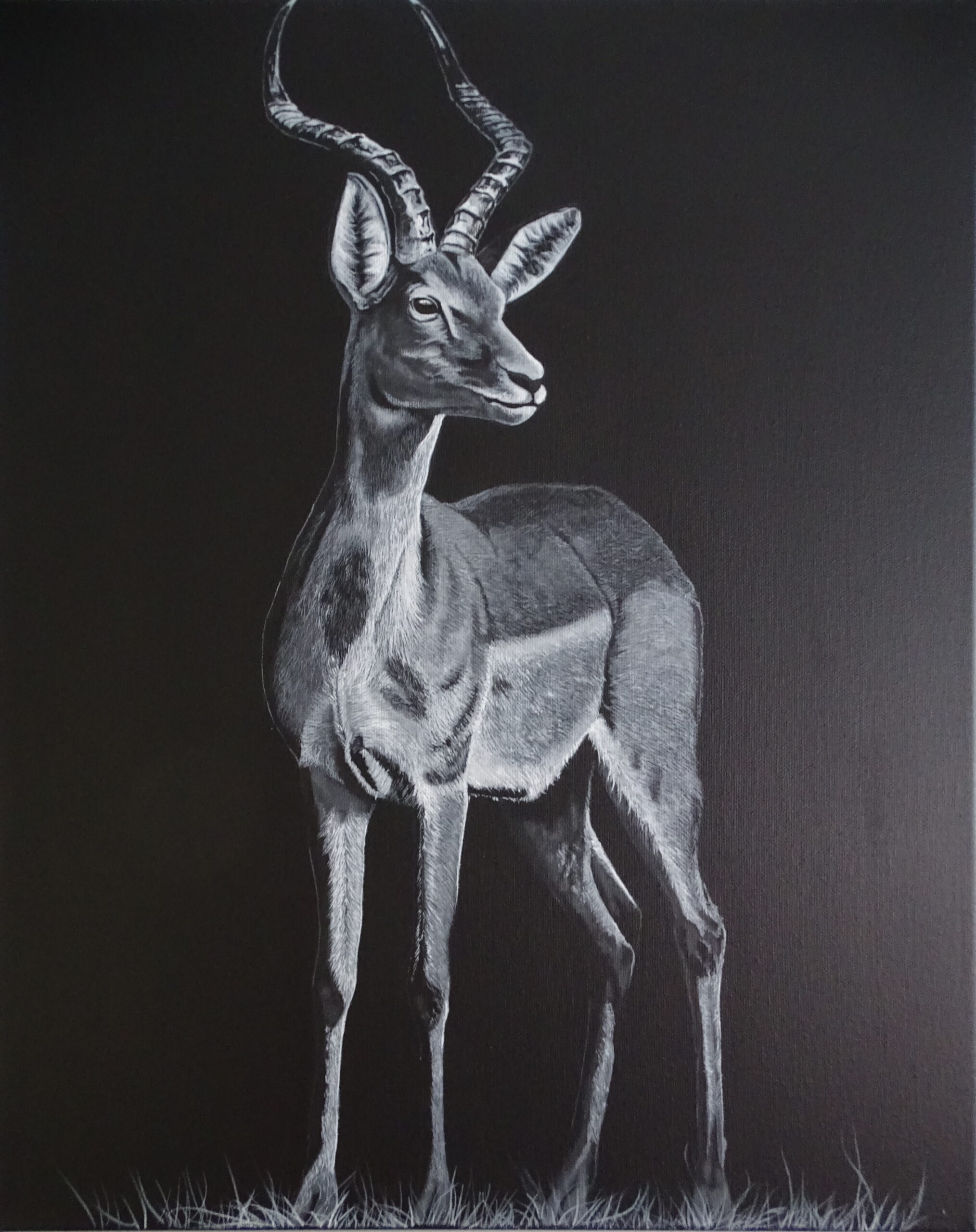 Techniques utilisées : encre de Chine, acrylique et peinture à l’huile, sur toile 100% coton